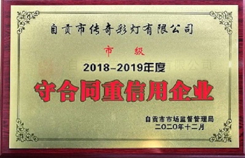 “人无信不立,事无信不成”,一个企业也是如此,因此,任何一个企业必须树立“守合同,重信用”的理念,才能在日趋开放、日益竞争的全求市场经济中立稳脚根。自贡市传奇彩灯有限公司将“诚信”作为一个理念,公司重合同守信用、诚信经营、积极进取,经自贡市市场监管局,评选为2018-2019年度市级“守合同重信用企业”。